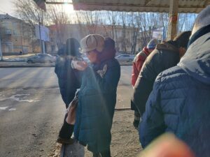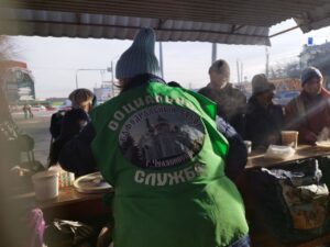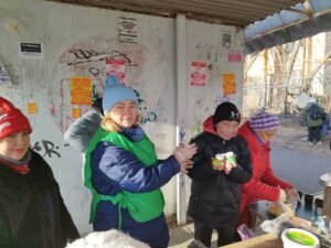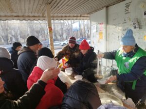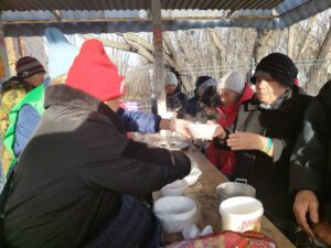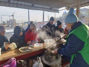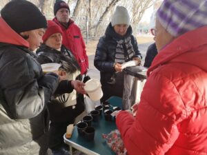 По традиции, кормление началось с общей молитвы. Затем волонтеры раздали горячую пищу пришедшим на кормление нуждающимся и напоили их чаем со сладким.